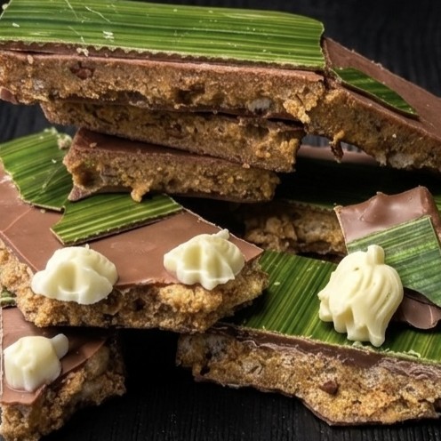 Praliné ultra gourmand, réalisé avec des noisettes, des amandes, grains de blé soufflé grué de cacao, enrobé chocolat lait, contient également beaucoup d’amour.