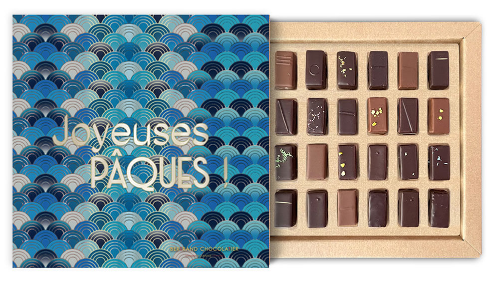 Coffret de 35 chocolats classiques, chocolats beaux et bons, et son packaging qui illuminera votre table de Pâques