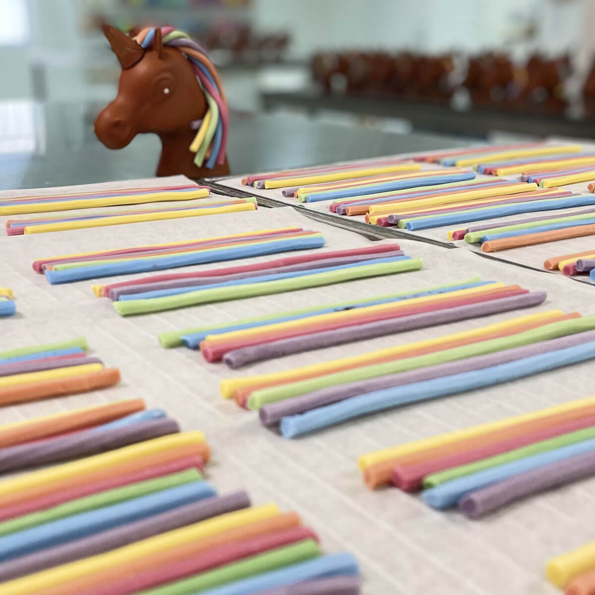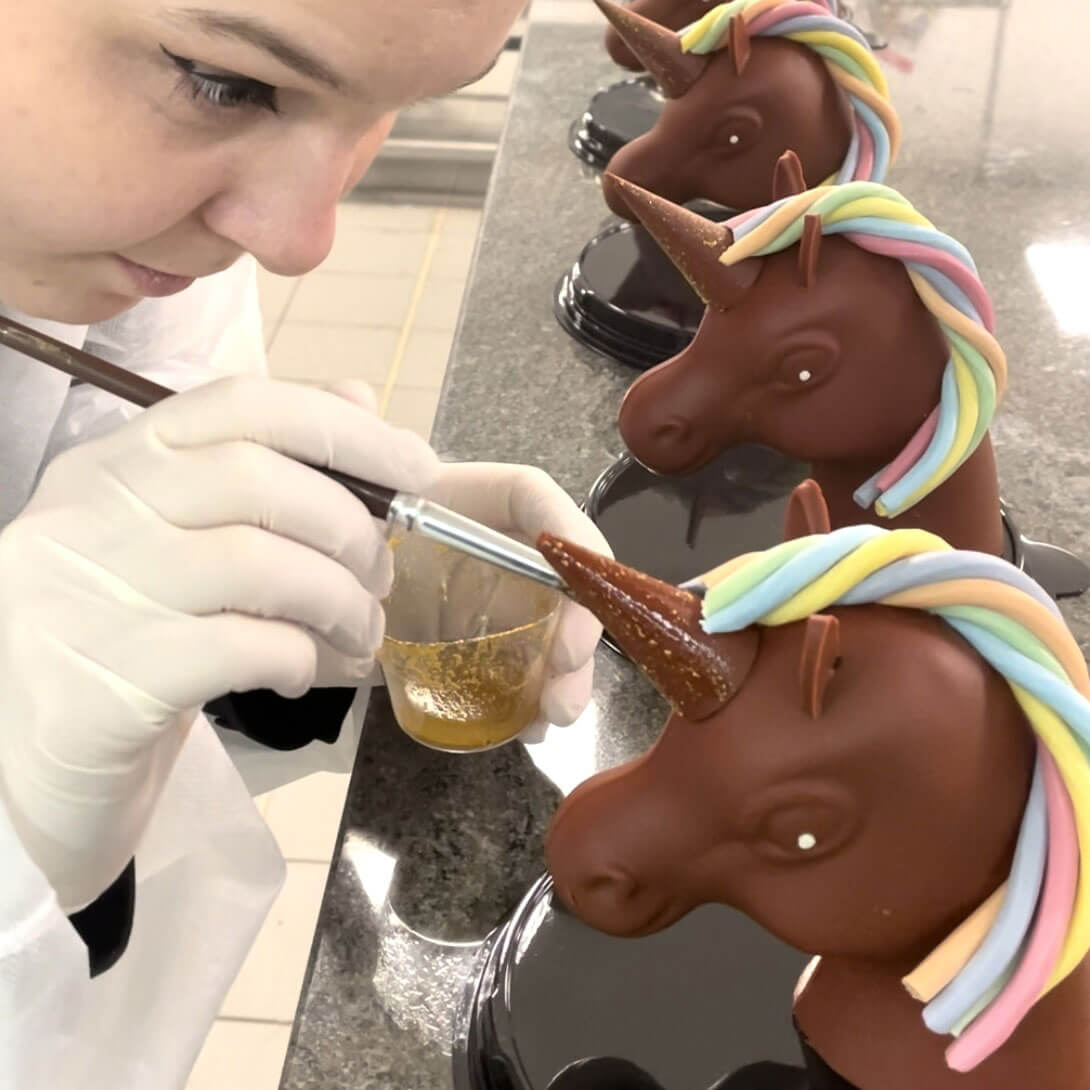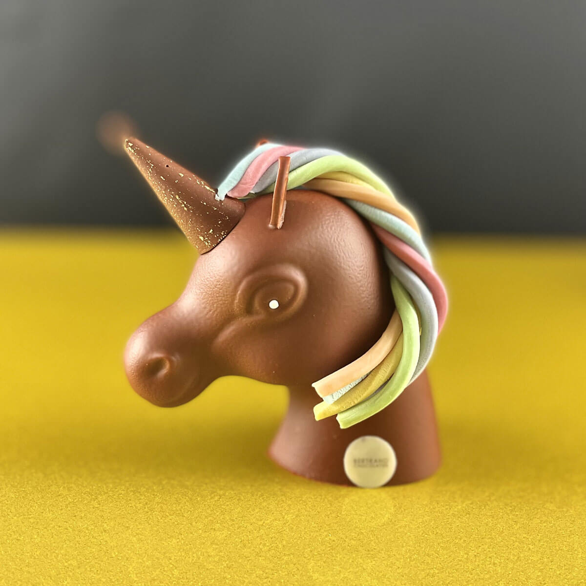 Avec son museau en chocolat fin, sa crinière chocolat blanc et sa corne recouverte de paillettes d’or, le plus difficile sera de l’entamer…