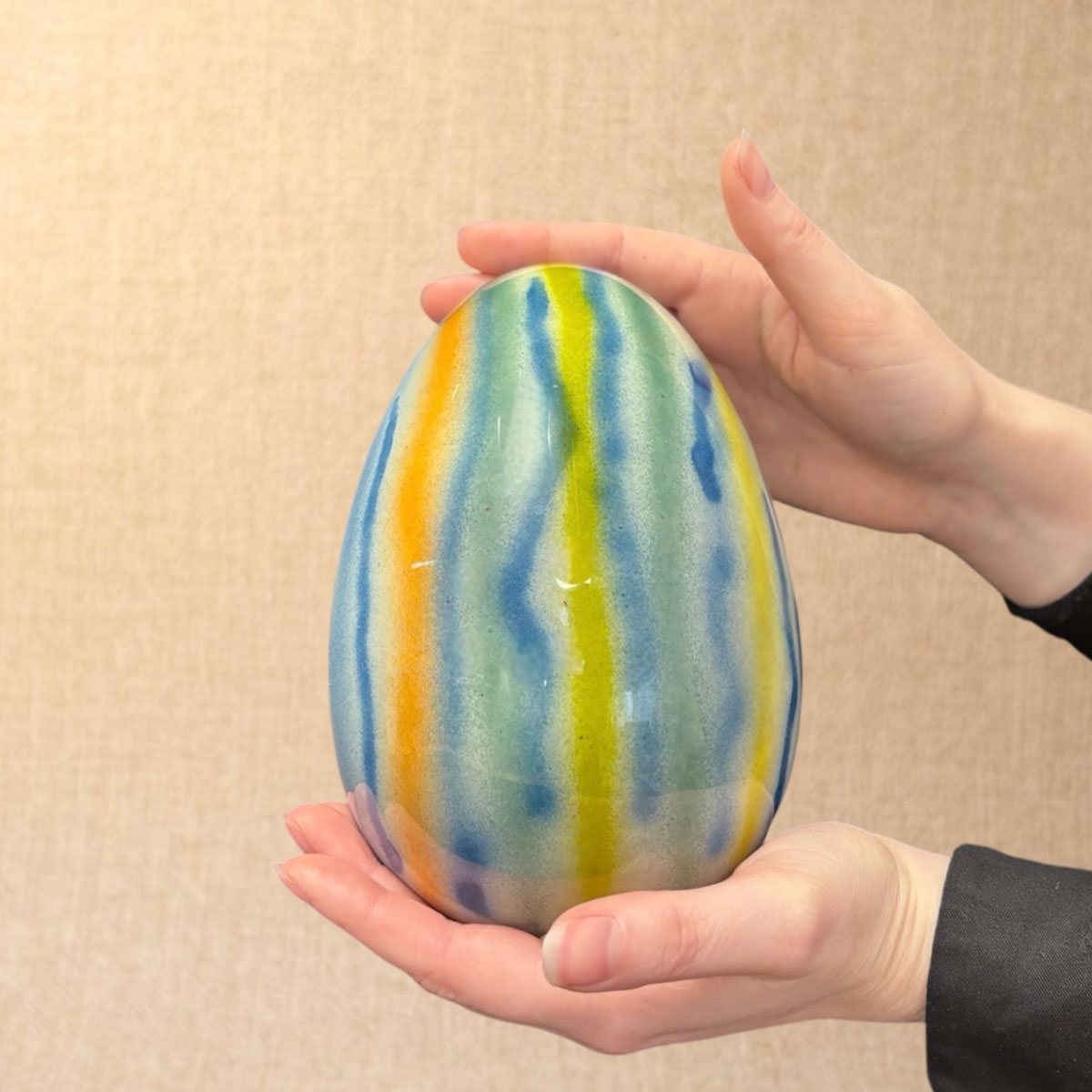 Un Oeuf – bijou pour vous accompagner durant les fêtes de Pâques, garni de friture en chocolat Lait Madagascar 43% et noire 66%, friture pralinée en lait et noire, friture en chocolat blond et chocolat blanc, œufs feuilletés pralinés, billes de céréales enrobées chocolat lait et chocolat noir, chocolat framboise et chocolat yuzu.