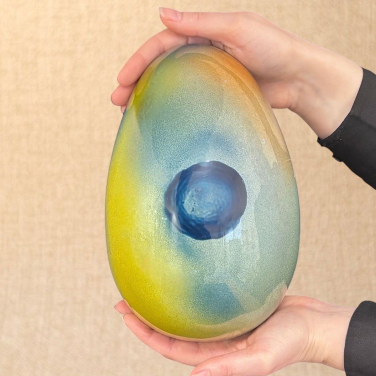 Un Oeuf – bijou pour vous accompagner durant les fêtes de Pâques, garni de friture en chocolat Lait Madagascar 43% et noire 66%, friture pralinée en lait et noire, friture en chocolat blond et chocolat blanc, œufs feuilletés pralinés, billes de céréales enrobées chocolat lait et chocolat noir, chocolat framboise et chocolat yuzu.
