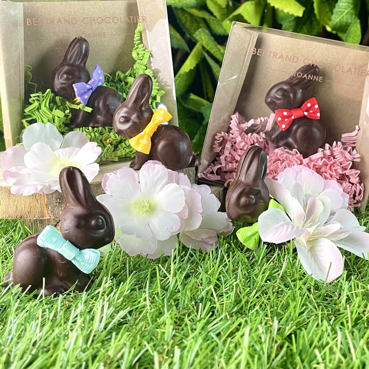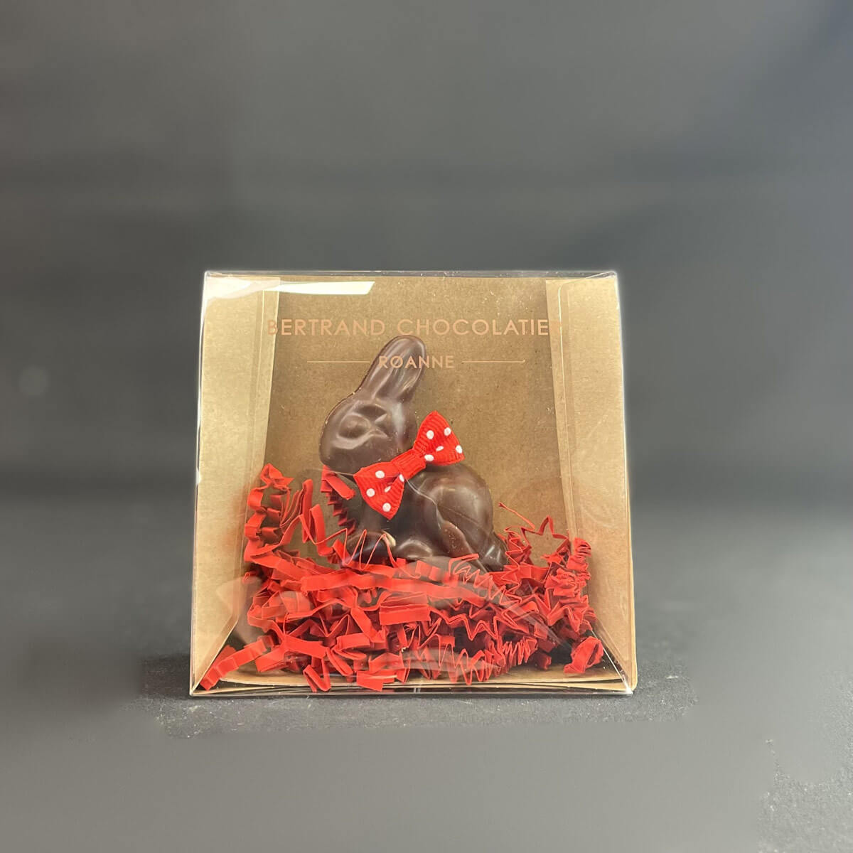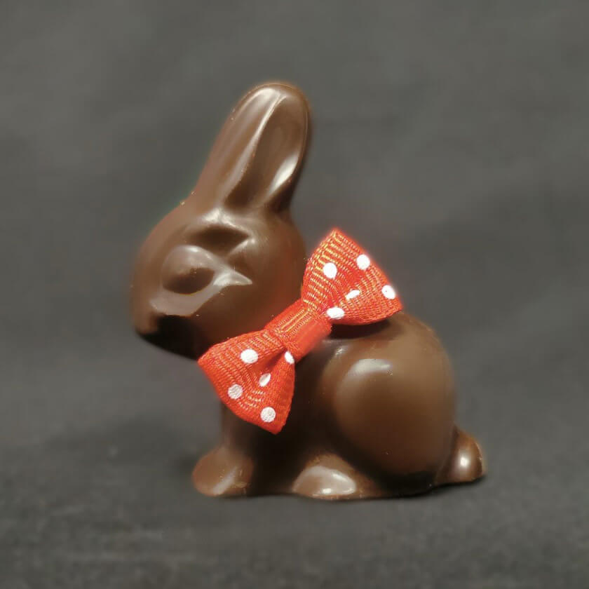 Praliné noisette maison enrobé chocolat noir 66% ou chocolat lait 43%, adorable avec son nœud papillon, gourmand à souhait, c’est votre chouchou de Pâques !