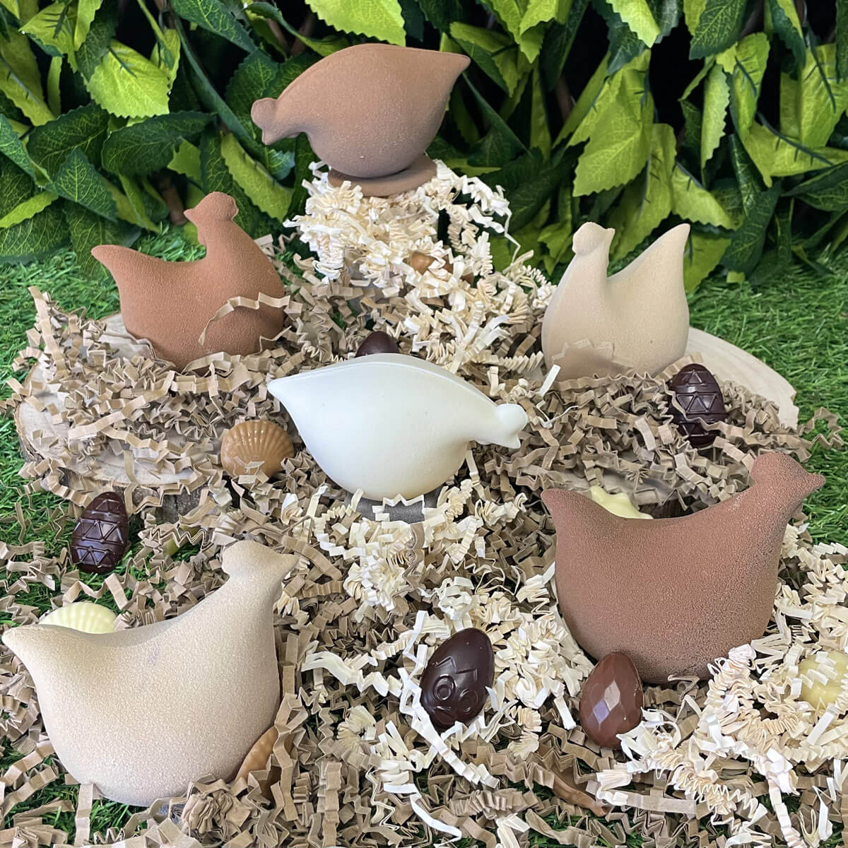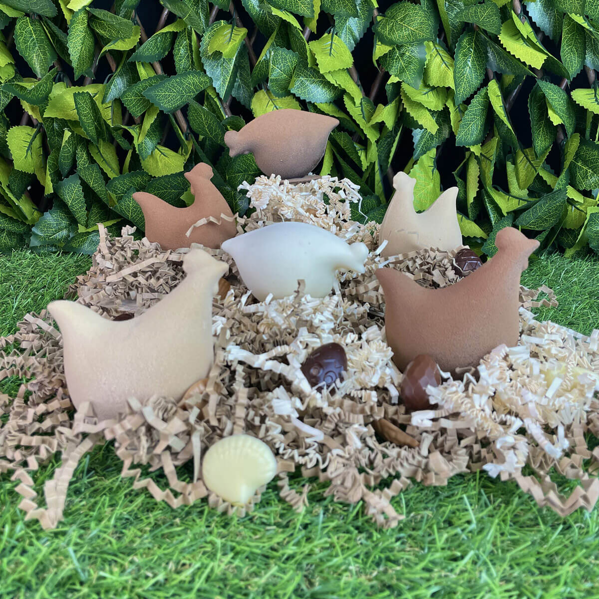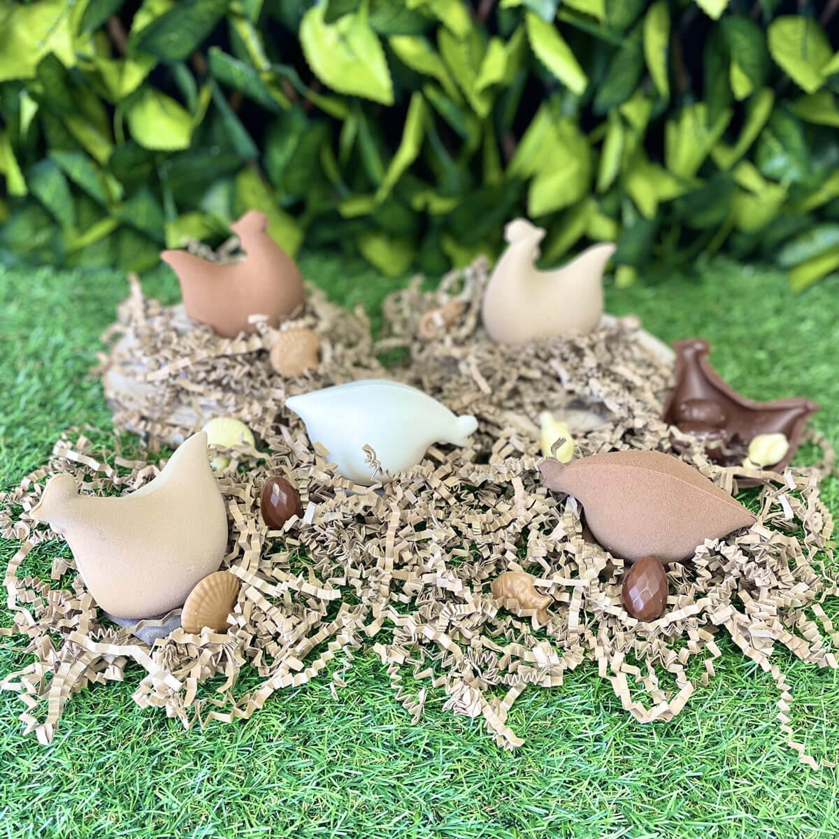 Mignonne, la petite poulette, pour vous accompagner durant les fêtes de Pâques, garni de friture en chocolat Lait Madagascar 43% et noire 66%, friture pralinée en lait et noire, friture en chocolat blond et chocolat blanc, œufs feuilletés pralinés, billes de céréales enrobées chocolat lait et chocolat noir, chocolat framboise et chocolat yuzu.